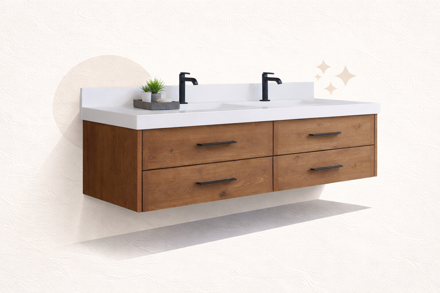Create a clean, modern look with floating vanities designed to match your space and your vision. Choose from a range of premium hardwoods, each offering its own distinct grain, tone, and character. Every vanity is built for strength and long-term durability using reinforced core construction, delivering both style and reliable performance.